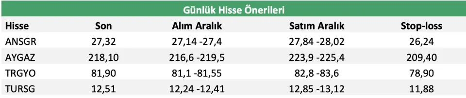 Destek Yatırım ANSGR, AYGAZ, TRGYO ve TURSG hisselerini bugünkü öneri listesinde paylaştı. Aracı kurum, "2025 yılının son çeyrek finansalları açıklanmaya başlıyor sigorta şirketlerinin finansal yatırım gelirlerinin net karlarına olumlu yansımasını beklediğimiz Anadolu Sigorta ve Türkiye Sigorta’yı, Tüpraş’tan gelecek yüksek karlılık ve operasyonel gelirlerinde artış nedeniyle Aygaz’ı, yüksek temettü verimi beklediğimiz Torunlar GYO’yu günlük hisse önerilerimize ekliyoruz." ifadeleirni kullandı.