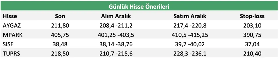 Aracı kurum, "İran kaynaklı jeopolitik arz endişeleri çerçevesinde Tüpraş’ı, Tüpraş’ın ana hissedarlarından biri olup görece geride kalan Aygaz’ı, İran’dan yapılabilecek düz cam ithalatının aksaması halinde avantaj sağlayabilecek Şişecam’ı ve güçlü operasyonel büyümesiyle defansif nitelik taşıyan Medikal Park’ı günlük hisse önerilerimiz arasında değerlendiriyoruz." ifadesini kullandı.