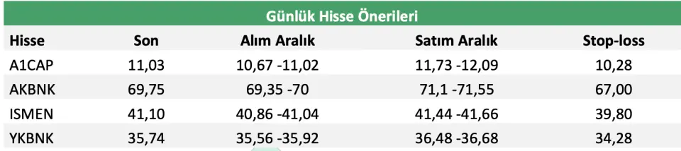 - "Bankacılık endeksinde son üç günlük düşüşün ardından bugün tepki alımlarının öne çıkmasını bekliyoruz. Akbank ve Yapı Kredi Bankası’nı; BDDK’nın enflasyon muhasebesine ilişkin kararı sonrasında aracı kurumlara yönelik beklentilerin güçlenebileceği öngörüsüyle İş Menkul Değerler ve A1 Capital hisselerini günlük önerilerimize ekliyoruz."