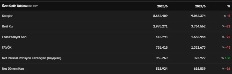 Şirket 2025 yılının ikinci çeyreğinde 8.632.409.000 TL satış gerçekleştirmiştir. 2024 yılının aynı dönemine oranla satış geliri %5 azalmıştır. 2024 yılının ikinci çeyreğinde satışlar 9.062.374.000 TL olarak kayıtlara geçmişti. 2025 yılının ikinci çeyreğinde brüt kar 2.978.271.000 TL olarak açıklanmıştır. 2024 yılının ikinci çeyreğinde ise bu veri 3.764.562.000 TL olarak açıklanmıştı. Esas faaliyet karını 416.793.000 TL olarak açıklayan şirket, 2024 yılının ikinci çeyreğinde esas faaliyet karını 1.666.944.000 TL olarak açıklamıştı.FAVÖK 2025 yılının ikinci çeyreğinde 755.418.000 TL olarak açıklanmıştır. Net Parasal Pozisyon Kazançları (Kayıpları) 2025 yılının ikinci çeyreğinde 965.269.000 TL olarak açıklanmıştır. 2024 yılının ikinci çeyreğinde 373.727.000 TL olarak açıklanan kazançlar, 2025 yılının ikinci çeyreğinde %158 artmış oldu. Net dönem kârı ise 518.924.000 TL olarak kaydedildi.