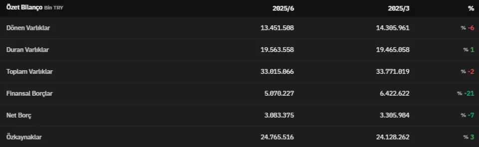 Finansal borçlar 2025 yılının ikinci çeyreğinde 5.070.227.000 TL olarak açıklandı. 2025 yılının ilk çeyreğinde 6.422.622.000 TL olarak açıklanan finansal borçlar, 2025 yılının ikinci çeyreğinde %21 azalmış oldu. 2025 yılının ikinci çeyreğinde net borç 3.083.375.000 TL olarak açıklandı Özkaynaklar 2025 yılının ikinci çeyreğinde 24.765.516.000 TL olarak duyurulmuştur.