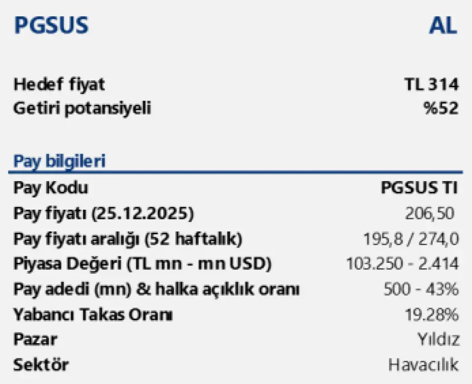 Yakından takibimizi sürdürdüğümüz bir diğer havacılık şirketi olan Pegasus’u 12 aylık pay başına 314 TL hedef fiyat ve “AL” tavsiyesiyle araştırma kapsamımıza alıyoruz. 2025 yılında jeopolitik gelişmeler, zayıf seyreden talep koşulları ve artan kapasite rekabetinin yarattığı baskılara rağmen Pegasus’un büyüme odaklı stratejisini koruduğunu görüyoruz. Güçlenen dış hat ağı, esnek kapasite yönetimi ve düşük maliyetli iş modeli sayesinde şirketin 2026 yılında da hacim büyümesini sürdürmesini, buna karşılık karlılık tarafında sınırlı ancak dengeli bir iyileşme sağlamasını bekliyoruz. Şirket, 2026T dönemi tahminlerimizde 5.8x F/K ve 4.9 FD/FAVÖK çarpanından işlem görmektedir.