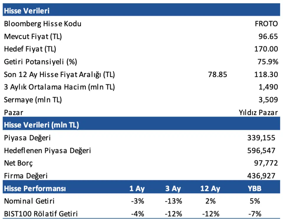 Deniz Yatırım, FROTO hissesi için hedef fiyatını 170,00 TL şeklinde belirtti. FROTO hisse önerisi AL oldu.