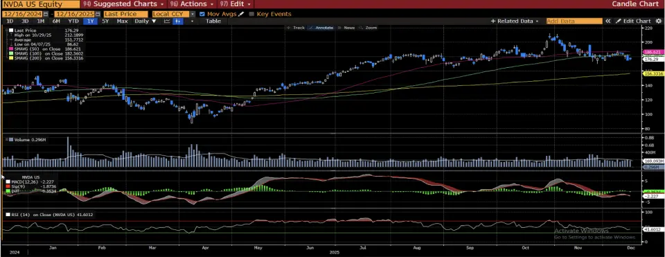 RSI değeri nötr bölgeye yakın, MACD ise negatifte seyrediyor; momentumun henüz güçlü bir yükseliş sinyali vermediği, aşırı satış baskısının ise bulunmadığı görülüyor. NVIDIA hissesi, 212,18 dolarlık zirveye yaklaşık %20 uzaklıkta bulunurken, kısa vadeli direnç seviyeleri 178,85 ve 181,35 dolar, destek seviyeleri ise 173,65 ve 170,95 dolar civarında yer alıyor. Şirketin piyasa değeri 4,285 trilyon dolar seviyesinde bulunuyor ve analistlerin %92,7’si “Al”, %1,2’si “Sat” ve %6,1’i “Tut” yönünde görüş bildiriyor.