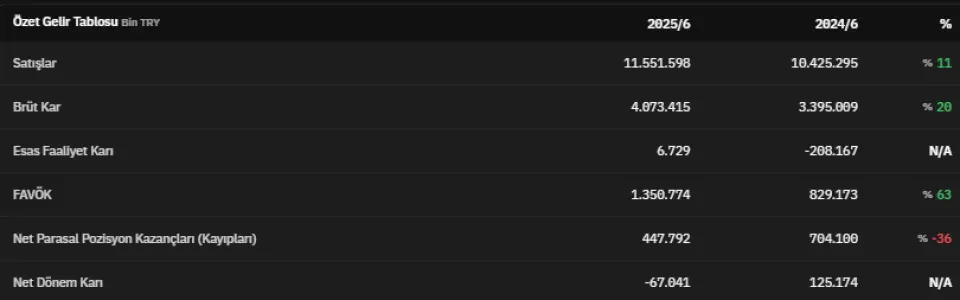 Şirket 2025 yılının ikinci çeyreğinde 11.551.598.000 TL satış gerçekleşti. 2024 yılının aynı dönemine oranla satış geliri %11 arttı. 2024 yılının ikinci çeyreğinde satışlar 10.425.295.000 TL olarak kayıtlara geçmişti. 2025 yılının ikinci çeyreğinde brüt kar 4.073.415.000 TL olarak açıklanmıştır. 2024 yılının ikinci çeyreğinde ise bu veri 3.395.009.000 TL olarak açıklanmıştı. Böylece brüt kar, 2025 yılının ikinci çeyreğinde %20 artmış oldu.Esas faaliyet karını 6.729.000 TL olarak açıklayan EBEBK, 2024 yılının ikinci çeyreğinde esas faaliyet karını -208.167.000 TL olarak açıklamıştı. FAVÖK 2025 yılının ikinci çeyreğinde 1.350.774.000 TL olarak açıklandı. 2024 yılının ikinci çeyreğinde 829.173.000 TL olarak açıklanan FAVÖK, 2025 yılının ikinci çeyreğinde %63 artmış oldu.
