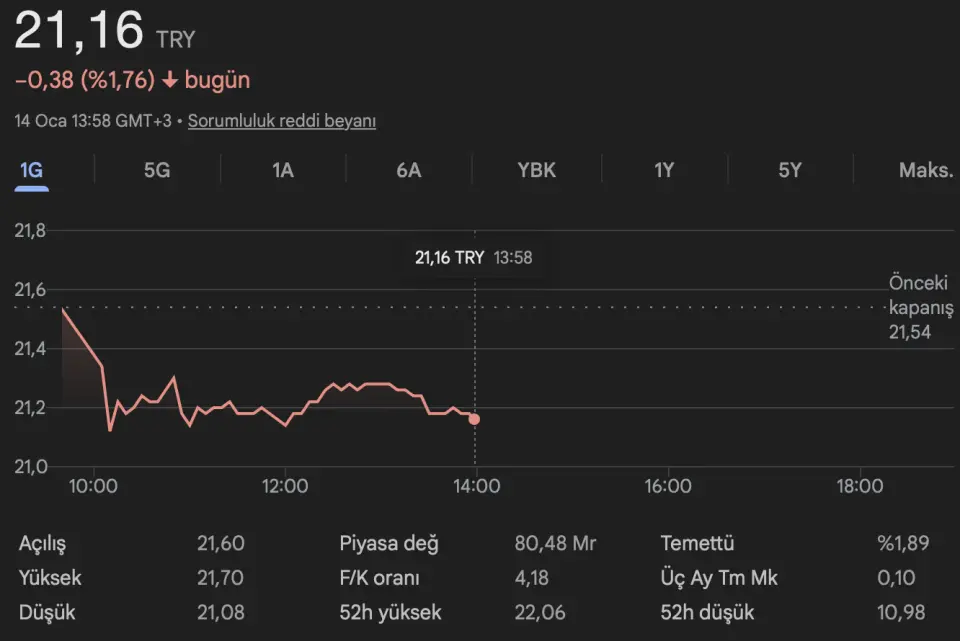 Kapanış (TL): 21.54 - Hedef Fiyat (TL): 34.16 - Piyasa Deg. (TL): 81852 - 3A Ort. İşl.Hac.(mn$): 76.88
