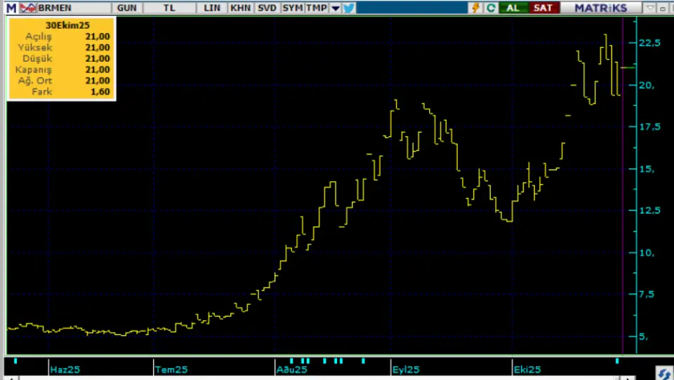 BRMEN Ekim ayı başında 11,85 TL fiyattaydı. Hisse ay boyunca primlenmeye devam etti ve 22,98 TL zirve fiyata kadar durmadan prim yaptı. Hissede uygulanmkata olan açığa satış ve kredili işlem yasağı ile brüt takas tedbirlerine ek olarka bugün emir paketi tedbiri de başlıyor. Bütün bu tedbirler 1 ay boyunca uygulanacak.