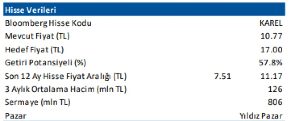 Deniz Yatırım şirket bilançosunu ve mali tablolarını değerlendirdi. Hisse ve şirket için genel olarak olumlu bir görüş sahibi olan kurum, hisseye 17 TL hedef fiyat verdi ve hisseden %57,8 kazanç beklediğini açıkladı. KAREL bu günlere borsada 10 TL civarı fiyatlardan işlem görüyor.