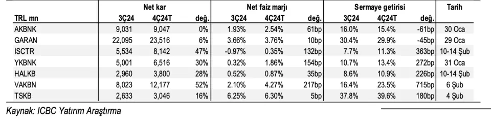 ICBC Yatırım, takip ettiği bankaların toplam net karının 4Ç24’te çeyreklik bazda yüzde 20 artmasını ancak yıllık bazda yüzde 33 gerilemesini beklediğini aktardı. Aracı kurum bu çeyrekte İş Bankası ve Vakıfbank’ın en yüksek net kar artışını sağlayan bankalar olmasını bekliyor. Ayrıca, Garanti’nin ise en yüksek net kar rakamını açıklayacağını tahmin ediyor. Kurumun araştırma kapsamındaki tüm bankaların net karlarının çeyreklik bazda artması bekleniyor.