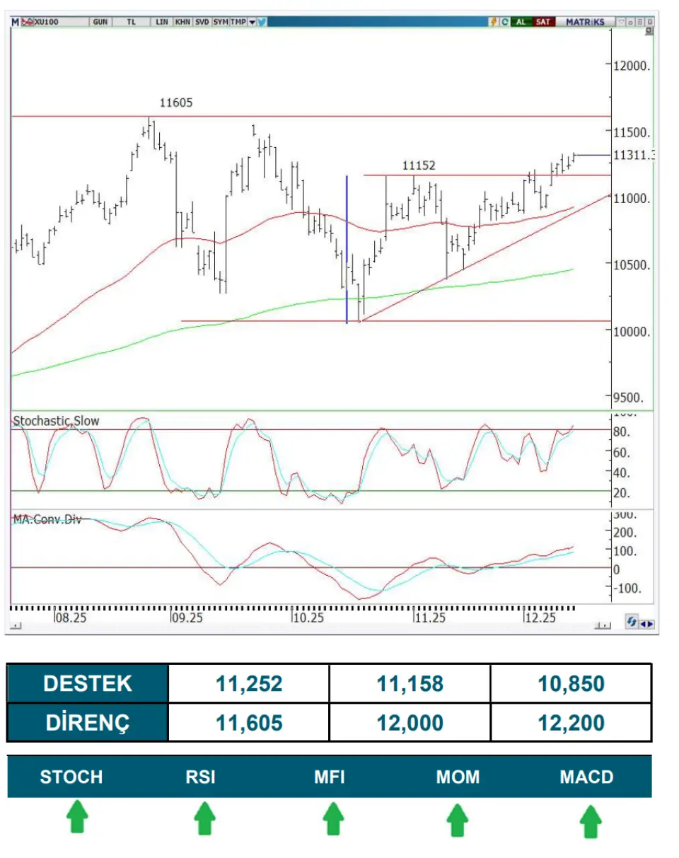 Cuma günü izlenen yukarı yönlü eğri, alım iştahının halen güçlü olduğunu düşündürürken, göstergelerin genelinde yukarı yönlü sinyallerin korunması da bu görüşümüzü destekliyor. Özellikle momentum ve RSI tarafındaki pozitif görünüm, geri çekilmelerin şu aşamada sınırlı kalabileceğine işaret ediyor. Diğer yandan bir önceki tarihi zirve olan 11.252 seviyesinin üzerinde gerçekleşen kapanışı da olumlu buluyoruz. Haftanın ilk işlem gününe alıcılı başlamasını beklediğimiz endekste 11.252 seviyesini artık ilk destek olarak takip edeceğiz. Bu seviyenin üzerinde kalındığı sürece mevcut yükseliş eğiliminin korunmasını bekliyoruz.