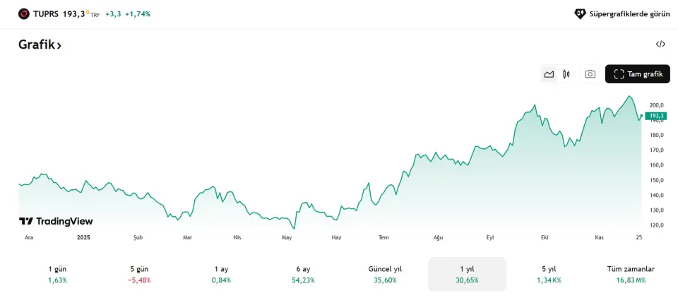 Türkiye’nin en büyük enerji şirketlerinden biri olan Tüpraş, son yıllarda yatırımcısına dikkat çekici bir kazanç sunmayı başardı. Uzun vadeli performansa bakıldığında hisse son beş yılda yüzde 1340’ın üzerinde getiri sağlayarak yatırımcılarına sermayelerini katlama imkânı verdi. Bu güçlü tablo, Tüpraş’ı Borsa İstanbul’un en çok kazandıran şirketleri arasında üst sıralara taşıdı ve uzun vadede pozisyonda kalan yatırımcıların memnuniyetini artırdı.