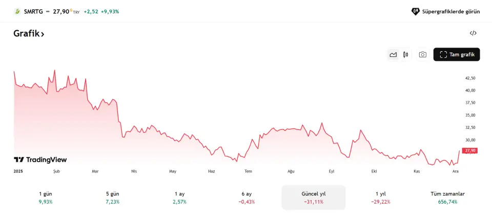 SMART Güneş Enerjisi Teknolojileri, son dönemlerde en fazla değer kaybeden şirketler arasında yer alıyor. Şirketin hissesi son 1 yıl içinde yaklaşık %30 oranında geriledi. Bu düşüş karşısında yatırımcılar kaybın boyutuna dikkat çekerken, enflasyonun da etkisiyle alım gücünün belirgin şekilde azaldığı ifade ediliyor.