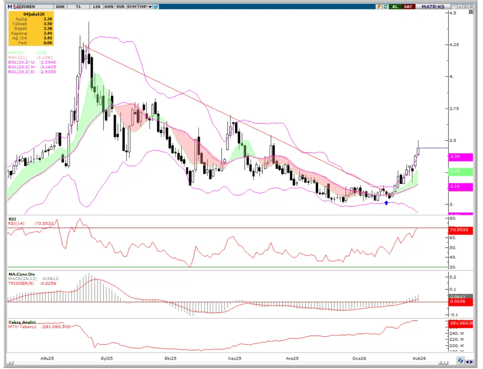 nedeniyle ZOREN hissesininde kısa vadede 3,47TL ve 3,54TL direnç seviyelerine doğru hareketler hız kazanabilir.