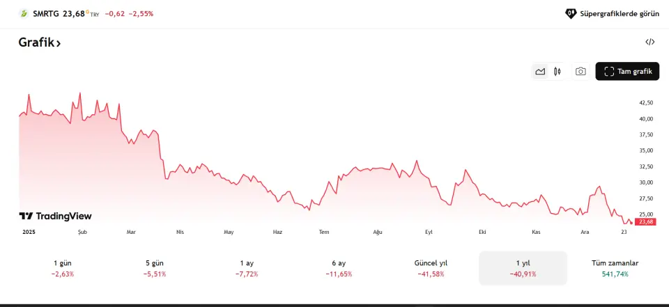 Gün sonuna doğru hissede yaklaşık %2 oranında düşüş yaşanırken, Smart Güneş’in hisse fiyatı 23,40 TL seviyelerine kadar geriledi.