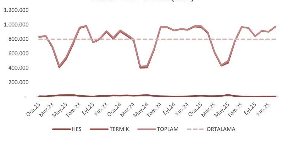 - "2025 Aralık ayına ait üretim verilerine bakıldığında, üretim 2024 yılının aynı ayına göre yatay kalıp, 2023 yılının Aralık ayına kıyasla ise %15,97 artarak 974.587 MWh olmuştur."