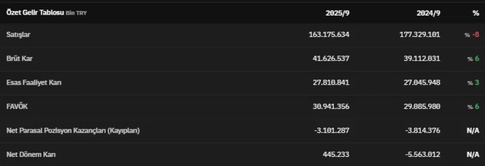 FAVÖK 2025 yılının üçüncü çeyreğinde 30.941.356.000 TL olarak açıklandı. Net parasal pozisyon kazançları 2025 yılının üçüncü çeyreğinde -3.101.287.000 TL olarak kaydedildi. Net dönem kârı ise 445.233.000 TL olarak kaydedildi. İlgili veri 2024 yılının üçüncü çeyreğinde -5.563.012.000 TL olarak açıklanmıştı.