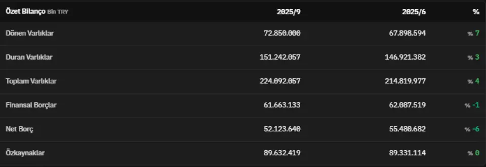 Dönen varlıklar 2025 yılının üçüncü çeyreğinde 72.850.000.000 TL olmuştur. 2025 yılının üçüncü çeyreğinde 151.242.057.000 TL olarak açıklanan duran varlıklar, 2025 yılının ikinci çeyreğinde 146.921.382.000 TL olarak açıklanmıştı. Toplam varlıklar üçüncü çeyrekte 224.092.057.000 TL olarak kaydedildi. Finansal borçlar 2025 yılının üçüncü çeyreğinde 61.663.133.000 TL olarak kaydedildi. 2025 yılının ikinci çeyreğinde 62.087.519.000 TL olarak açıklanan finansal borçlar, üçüncü çeyrekte %1 azalmış oldu.