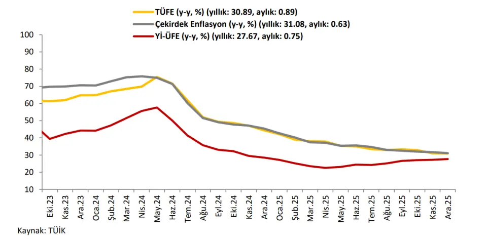 Tüketici Fiyat Endeksi (TÜFE) Aralık ayında %1.00 artış olan piyasa beklentilerinin altında %0.89 arttı ve yıllık bazda Kasım ayındaki %31.07’den Aralık ayında %30.89’a geriledi. Böylelikle yıllık enflasyon 2024 yılındaki %44.38 seviyesinden 2025 yılında %30.89 seviyesine gerilemiş oldu.