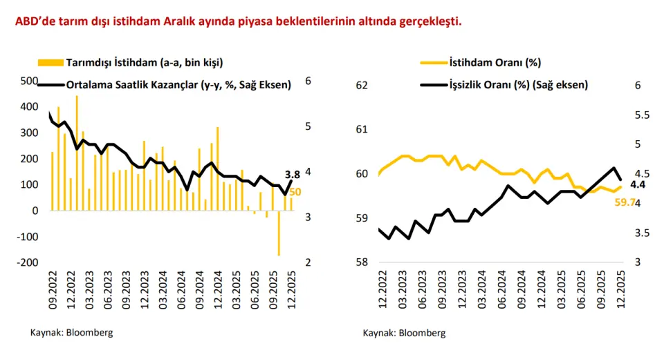 Aralık ayı tarım dışı istihdam verisi 70 bin olan beklentilerin altında 50 bin kişi artış kaydetti. Kasım ve Ekim ayı verileri toplamda 76 bin kişi aşağı yönlü revize edildi. Kasım ayında beklentilerin üzerinde %4.6 olarak gerçekleşen işsizlik oranı, Aralık ayında %4.5 olan beklentilerin altında %4.4 seviyesine geriledi.
