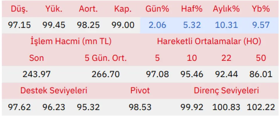 Gün içinde en düşük 97.15 en yüksek 99.45 seviyesini gören Enerjisa Enerji hissesinin günü %2.06 kazançla tamamladığı gözlenmektedir. Pivot seviye 98.53 seviyesinden geçmekte olup, aşağı yönlü hareketlerde birinci destek 97.62, ikinci destek ise 96.23 seviyesinden geçmektedir. Dirençler ise sırasıyla 99.92, 100.83 seviyelerinden geçmektedir. Bu aşamada endeksin 5 günlük HO seviyesinin %1.98 üstünde, 22 günlük HO seviyesinin ise %7.10 üstünde hareket ettiği dikkat çekmektedir. Son gün işlem hacmi ise bu aşamada 5 günlük ortalama işlem hacminin % 8.52 altında gerçekleşmiştir.