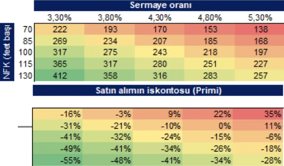 Ancak, açık web kaynaklarına dayanan ön analizimiz, Mayfair'deki B sınıfı ofislerin ortalama kiralarının feet başına yaklaşık 100 GBP olduğunu ve Bloomberg'e göre ortalama sermaye oranının ~%4 olduğunu gösteriyor. Bu metrikleri ve %90 doluluk ve ~%60 net faaliyet karı marjı varsayımlarını kullanarak, bina için kabaca bulduğumuz değer ~240 milyon GBP’dir (~325 milyon USD); bu da satın alma maliyetine (GDP186mn) göre ~%30 prim anlamına geliyor.