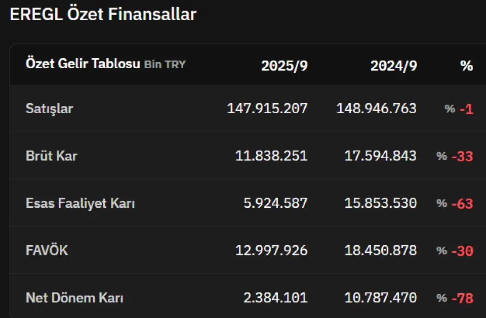 Beklentilere paralel sonuçlar. EREGL, 2025 yılının üçüncü çeyreğinde beklentilerin hafif üstünde 52,9 milyar TL ciro, beklentilerin hafif altında 4,7 milyar TL FAVÖK ve beklentilerin hafif üstünde 651 milyon TL net kar açıkladı. Açıklanan finansallar 2024 yılının aynı çeyreğiyle göre karşılaştırıldığında ciro %9, FAVÖK %4 artarken, net kar %21 azaldı. 9 aylık dönemler kıyaslandığında, 9A24’e göre 9A25’te ciro, FAVÖK ve net kar sırasıyla %1, %30, %78 azaldı.