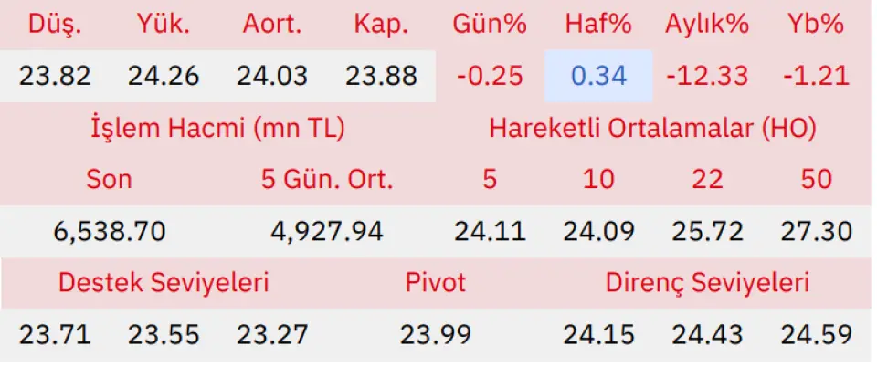 Gün içinde en düşük 23.82 en yüksek 24.26 seviyesini gören Ereğli Demir ve Çelik Fabrikaları hissesinin günü %0.25 kayıpla tamamladığı gözlenmektedir. Pivot seviye 23.99 seviyesinden geçmekte olup, aşağı yönlü hareketlerde birinci destek 23.71, ikinci destek ise 23.55 seviyesinden geçmektedir. Dirençler ise sırasıyla 24.15, 24.43 seviyelerinden geçmektedir. Bu aşamada endeksin 5 günlük HO seviyesinin %0.96 altında, 22 günlük HO seviyesinin ise %7.14 altında hareket ettiği dikkat çekmektedir. Son gün işlem hacmi ise bu aşamada 5 günlük ortalama işlem hacminin % 32.69 üstünde gerçekleşmiştir.