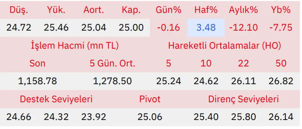 Gün içinde en düşük 24.72 en yüksek 25.46 seviyesini gören Kardemir Karabük Demir Çelik D hissesinin günü %0.16 kayıpla tamamladığı gözlenmektedir. Pivot seviye 25.06 seviyesinden geçmekte olup, aşağı yönlü hareketlerde birinci destek 24.66, ikinci destek ise 24.32 seviyesinden geçmektedir. Dirençler ise sırasıyla 25.40, 25.80 seviyelerinden geçmektedir. Bu aşamada endeksin 5 günlük HO seviyesinin %0.97 altında, 22 günlük HO seviyesinin ise %4.25 altında hareket ettiği dikkat çekmektedir. Son gün işlem hacmi ise bu aşamada 5 günlük ortalama işlem hacminin % 9.36 altında gerçekleşmiştir.