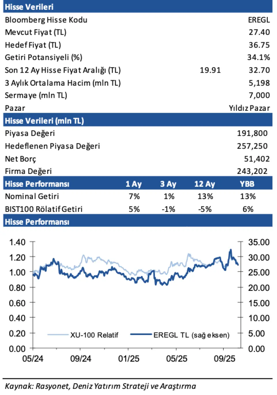 - Deniz Yatırım, EREGL hissesi için hedef fiyatını 36,75 TL ve hisse tavsiyesini AL olarak duyurdu. EREGL hissesinin getiri potansiyeli de %34 olarak açıklandı.