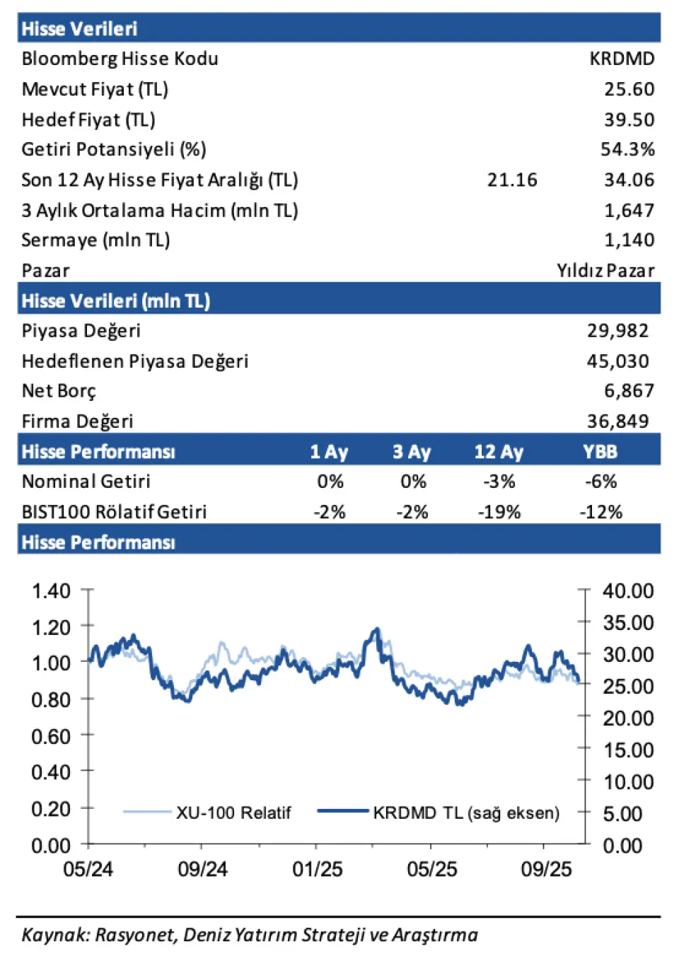 - KRDMD hissesi için hedef fiyat ise 39,50 TL oldu. KRDMD hisse önerisi de AL şeklinde sunuldu. KRDMD hissesinin getiri potansiyeli ise %54 şeklinde belirtildi.