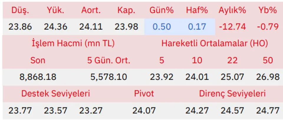 Gün içinde en düşük 23.86 en yüksek 24.36 seviyesini gören Ereğli Demir ve Çelik Fabrikaları hissesinin günü %0.50 kazançla tamamladığı gözlenmektedir. Pivot seviye 24.07 seviyesinden geçmekte olup, aşağı yönlü hareketlerde birinci destek 23.77, ikinci destek ise 23.57 seviyesinden geçmektedir. Dirençler ise sırasıyla 24.27, 24.57 seviyelerinden geçmektedir. Bu aşamada endeksin 5 günlük HO seviyesinin %0.25 üstünde, 22 günlük HO seviyesinin ise %4.34 altında hareket ettiği dikkat çekmektedir. Son gün işlem hacmi ise bu aşamada 5 günlük ortalama işlem hacminin % 58.98 üstünde gerçekleşmiştir.