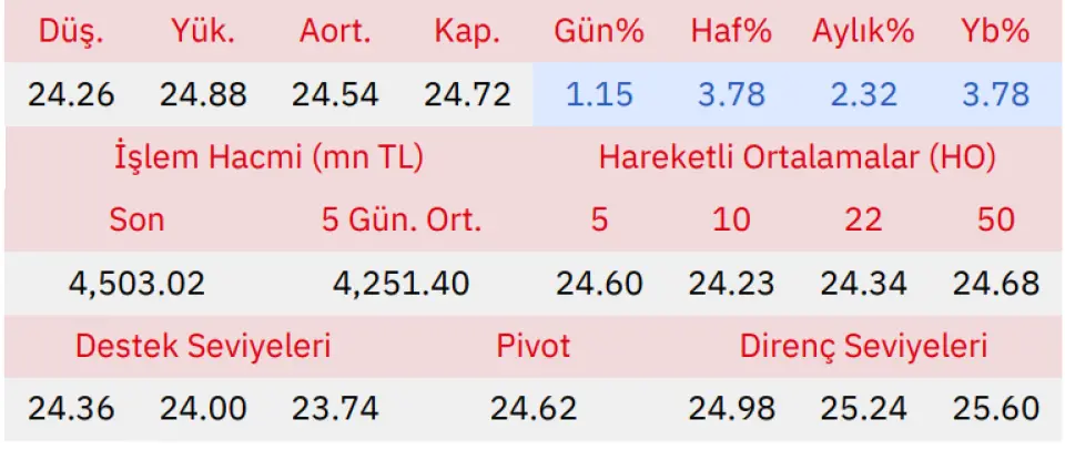 Gün içinde en düşük 24.26 en yüksek 24.88 seviyesini gören Ereğli Demir ve Çelik Fabrikaları hissesinin günü %1.15 kazançla tamamladığı gözlenmektedir. Pivot seviye 24.62 seviyesinden geçmekte olup, aşağı yönlü hareketlerde birinci destek 24.36, ikinci destek ise 24.00 seviyesinden geçmektedir. Dirençler ise sırasıyla 24.98, 25.24 seviyelerinden geçmektedir. Bu aşamada endeksin 5 günlük HO seviyesinin %0.47 üstünde, 22 günlük HO seviyesinin ise %1.58 üstünde hareket ettiği dikkat çekmektedir. Son gün işlem hacmi ise bu aşamada 5 günlük ortalama işlem hacminin % 5.92 üstünde gerçekleşmiştir.