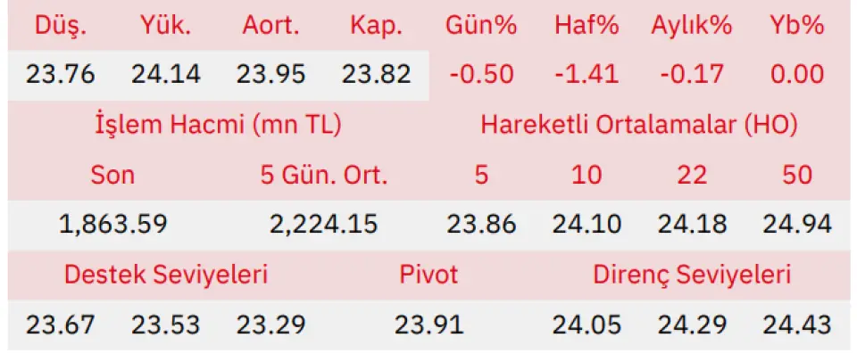 Gün içinde en düşük 23.76 en yüksek 24.14 seviyesini gören Ereğli Demir ve Çelik Fabrikaları hissesinin günü %0.50 kayıpla tamamladığı gözlenmektedir. Pivot seviye 23.91 seviyesinden geçmekte olup, aşağı yönlü hareketlerde birinci destek 23.67, ikinci destek ise 23.53 seviyesinden geçmektedir. Dirençler ise sırasıyla 24.05, 24.29 seviyelerinden geçmektedir. Bu aşamada endeksin 5 günlük HO seviyesinin %0.15 altında, 22 günlük HO seviyesinin ise %1.49 altında hareket ettiği dikkat çekmektedir. Son gün işlem hacmi ise bu aşamada 5 günlük ortalama işlem hacminin % 16.21 altında gerçekleşmiştir.