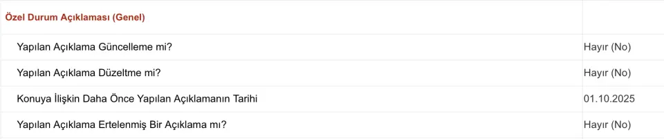 "Şirketimizin 01.10.2025 tarihi itibarıyla net aktif değer tablosuna göre pay başına net aktif değeri 3,608149 TL'dir. 01.10.2025 tarihi itibarıyla ortaklık payımızın BİAŞ'ta oluşan ağırlıklı ortalama fiyatı, pay başına net aktif değerinin 2 katını aşmıştır.