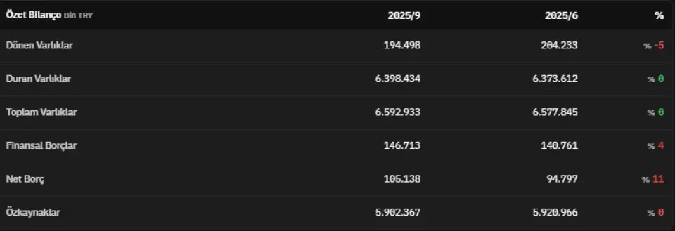 Dönen varlıklar 2025 yılının üçüncü çeyreğinde 194.498.000 TL olmuştur. 2025 yılının üçüncü çeyreğinde 6.398.434.000 TL olarak açıklanan duran varlıklar, 2025 yılının ikinci çeyreğinde 6.373.612.000 TL olarak açıklanmıştı. Toplam varlıklar üçüncü çeyrekte 6.592.933.000 TL olarak kaydedildi. Finansal borçlar 2025 yılının üçüncü çeyreğinde 146.713.000 TL olarak kaydedildi. 2025 yılının ikinci çeyreğinde 140.761.000 TL olarak açıklanan finansal borçlar, üçüncü çeyrekte %4 artmış oldu.