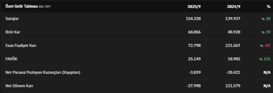 FAVÖK 2025 yılının üçüncü çeyreğinde 25.149.000 TL olarak açıklandı. 2024 yılının üçüncü çeyreğinde 10.902.000 TL olarak açıklanan FAVÖK, 2025 yılının üçüncü çeyreğinde %131 artmış oldu. Net parasal pozisyon kazançları 2025 yılının üçüncü çeyreğinde -3.039.000 TL olarak kaydedildi. Net dönem kârı ise -27.998.000 TL olarak kaydedildi. İlgili veri 2024 yılının üçüncü çeyreğinde 221.579.000 TL olarak açıklanmıştı.