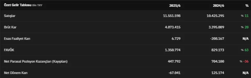 Şirket 2025 yılının ikinci çeyreğinde 11.551.598.000 TL satış gerçekleşti. 2025 yılının ikinci çeyreğinde brüt kar 4.073.415.000 TL olarak açıklandı. 2024 yılının ikinci çeyreğinde 3.395.009.000 TL olarak açıklanan brüt kar, 2025 yılının ikinci çeyreğinde %20 artmış oldu. Esas faaliyet karını 6.729.000 TL olarak açıklayan EBEBK, 2024 yılının ikinci çeyreğinde esas faaliyet karını -208.167.000 TL olarak açıklamıştı.FAVÖK 2025 yılının ikinci çeyreğinde 1.350.774.000 TL olarak açıklandı.2024 yılının ikinci çeyreğinde 829.173.000 TL olarak açıklanan FAVÖK, 2025 yılının ikinci çeyreğinde %63 artmış oldu. Net parasal pozisyon kazançları 2025 yılının ikinci çeyreğinde 447.792.000 TL olarak kayıtlara geçti. Net dönem kârı ise -67.041.000 TL olarak kaydedildi. İlgili veri 2024 yılının ikinci çeyreğinde 125.174.000 TL olarak açıklanmıştı.