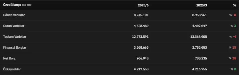 Dönen varlıklar 2025 yılının ikinci çeyreğinde 8.245.101.000 TL olmuştur. 2025 yılının ikinci çeyreğinde 4.528.489.000 TL olarak açıklanan duran varlıklar, 2025 yılının ilk çeyreğinde 4.407.047.000 TL olarak açıklanmıştı. Böylece duran varlıklar %3 artmış oldu. Toplam varlıklar 2025 yılının ikinci çeyreğinde 12.773.591.000 TL olarak açıklanmıştır.Finansal borçlar 2025 yılının ikinci çeyreğinde 3.208.663.000 TL olarak açıklandı. 2025 yılının ikinci çeyreğinde net borç 966.948.000 TL olarak açıklandı. Özkaynaklar 2025 yılının ikinci çeyreğinde 4.217.550.000 TL olarak duyurulmuştur. İlgili veri 2025 yılının ilk çeyreğinde 4.216.955.000 TL olarak açıklanmıştı.