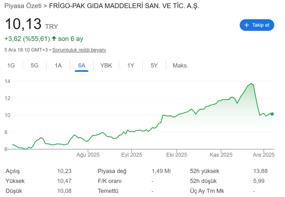 Yeni iş ilişkisi açıklamasının ardından şirketin Borsa İstanbul'daki güncel verileri de dikkat çekti. Güne 10,23 TL seviyesinden başlayan FRIGO hisseleri, gün içerisinde en düşük 10,08 TL, en yüksek ise 10,47 TL seviyelerini test etti.