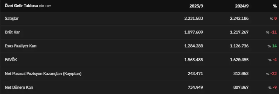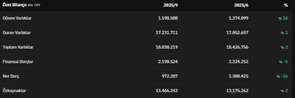 Dönen varlıklar 2025 yılının üçüncü çeyreğinde 1.598.508.000 TL olmuştur. 2025 yılının üçüncü çeyreğinde 17.231.711.000 TL olarak açıklanan duran varlıklar, 2025 yılının ikinci çeyreğinde 17.052.657.000 TL olarak açıklanmıştı. Finansal borçlar 2025 yılının üçüncü çeyreğinde 2.190.524.000 TL olarak kaydedildi.