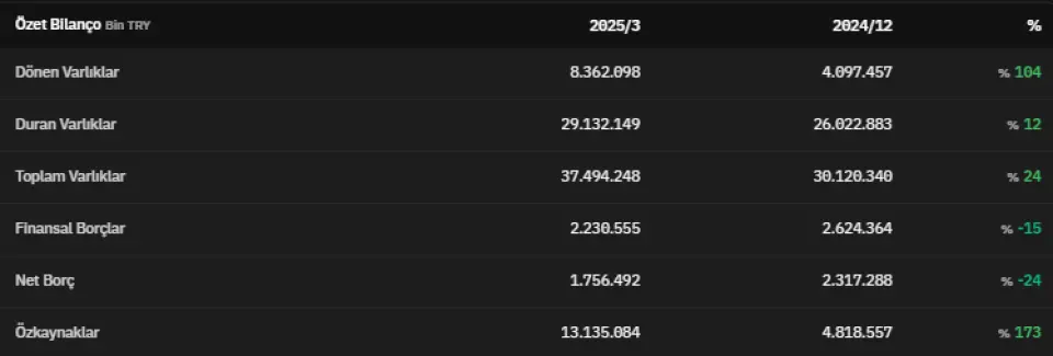 2025 yılının ilk çeyreğinde net borç 1.756.492.000 TL olarak açıklandı. 2024 yılının son çeyreğinde 2.317.288.000 TL olarak açıklanan net borç, 2025 yılının ilk çeyreğinde %24 azaldı. Özkaynaklar 2025 yılının ilk çeyreğinde 13.135.084.000 TL olarak duyuruldu. 2024 yılının son çeyreğinde 4.818.557.000 TL olarak açıklanan özkaynaklar, 2025 yılının ilk çeyreğinde %173 artmış oldu.