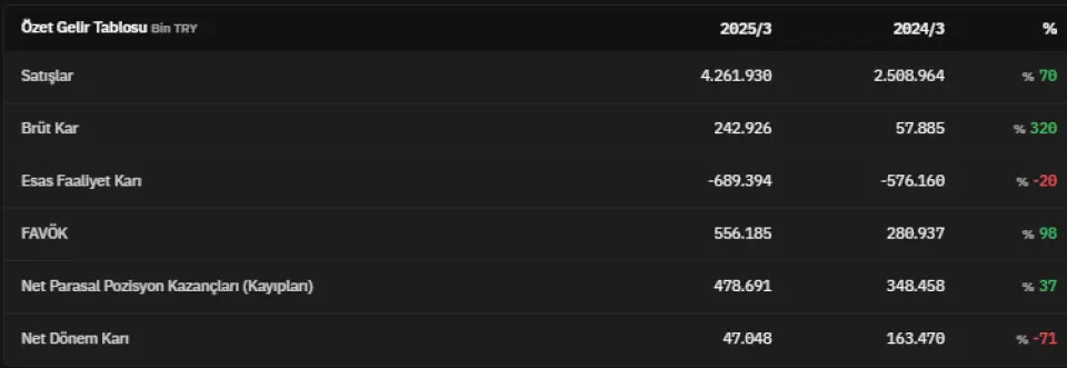 Şirket 2025 yılının ilk çeyreğinde 4.261.930.000 TL satış geliri elde etti. 2024 yılının aynı dönemine oranla satış geliri %70 arttı. 2024 yılında satışlar 2.508.964.000 TL olarak kayıtlara geçmişti. 2025 yılının ilk çeyreğinde brüt kar 242.926.000 TL olarak açıklandı. 2024 yılının ilk çeyreğinde ise bu veri 57.885.000 TL olarak açıklanmıştı. Böylece brüt kar, 2025 yılının ilk çeyreğinde %320 artmış oldu.