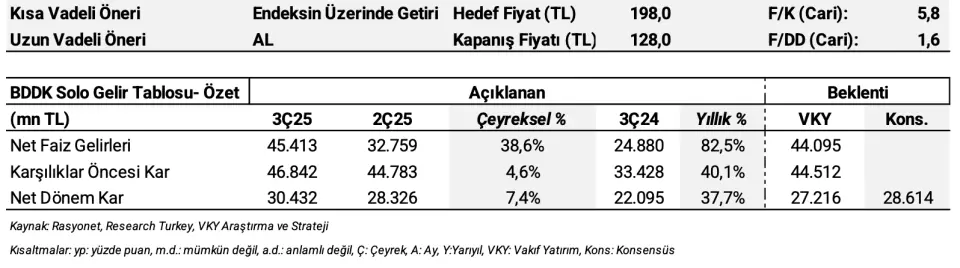 Borsa'nın aracı kurumu Vakıf Yatırım, Garanti Bankası'nın (GARAN) duyurduğu 2025 yılı 3. çeyrek finansal verilerini değerlendirdi. Vakıf Yatırım, GARAN hissesi için 12 aylık hedef fiyat verirken hisse tavsiyesini de duyurdu. Aracı kurum, GARAN bilançosu için "Net faiz marjında 70 bp artış görüldü" dedi.