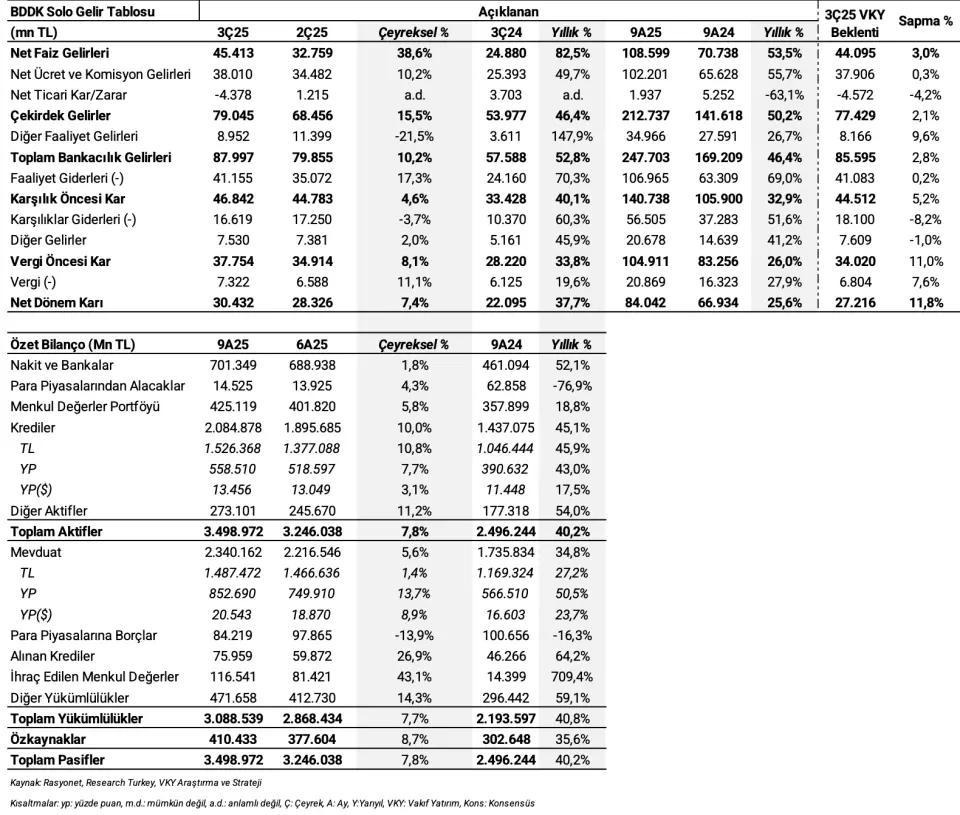 - "Garanti Bankası, 2025 üçüncü çeyrekte tahminlerin üzerinde, çeyreksel %7,4 artış ile 30,4 mlr TL net kar duyurdu. Bu süreçte ortalama özkaynak karlılığı %30,9 oldu (2Ç25: %31,6). Böylece bankanın 9A24 dönemindebankanın net karı yıllık bazda %25,6 artarak 84 mlr TL’ye ulaşırken, kümülatif özkaynak karlılığı %30,8 oldu (6A25: %30,7). Üçüncü çeyrekte TL kredi-mevduat makası sabit kaldı ancak bankanın net faiz gelirleri (swap dahil) önceki çeyreğe göre %23,7 artarak 36,9 mlr TL’ye yükselirken, net faiz marjında ise 70 bp artış yaşandı. Bu dönemde swap maliyetinin TL mevduat maliyetinin altında kalması sonucunda artan swap fonlaması sonucunda swap giderleri 2,9 mlr TL’den 8,5 mlr TL’ye çıktı. Diğer yandan, ödeme sistemlerindeki büyümenin desteğiyle komisyon gelirleri çeyreksel %10 artışla 38,0 mlr TL’ye ulaştı. 2025 yılı üçüncü çeyrekte net kredi riski maliyeti (kur etkisi hariç) 133 bp’den 161 bp’ye yükseldi, bu dönemde, önceki çeyreğe kıyasla yüksek tutarlı karşılık iptallerinin etkisinin azalmasıyla birlikte net karşılık giderlerinde artış görüldü."
