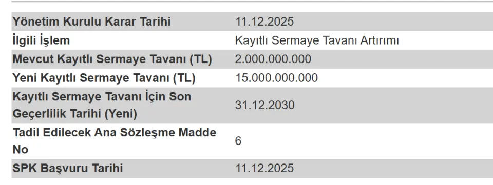 Şirket, kayıtlı sermaye tavanını 2.000.000.000 TL'den 15.000.000.000 TL'ye çıkartma kararı aldı. Bu karar doğrultusunda ise SPK'ya başvuruda bulunduğunu açıkladı! Bir sonraki kayıtlı sermaye tavanı için son geçerlilik tarihi ise 31 Aralık 2030 olarak belirlendi.