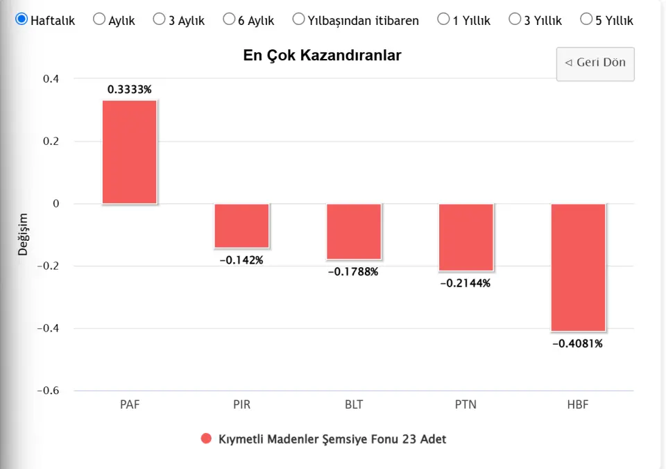 Kıymetli Madenler Şemsiye Fonu'nda yer alan bazı fonlar son bir aylık performansına baktığımızda yükseliş göstermiş olarak görünüyor. Bu fonlardan bazıları BLT, PAF, RPG, NAU ve TAL olmuş. Bu fonlar son bir ayda yükseliş göstermiş. Fakat son bir aylık performansa baktığımızda ise Kıymetli Madenler Şemsiye Fonu'nda yer alan fonlardan çoğu düşüş göstermiş. Bunlardan PAF yalnızca yükseliş gösterirken PIR, BLT, PTN ve HBF fonları kapanışını ekside yapmış.