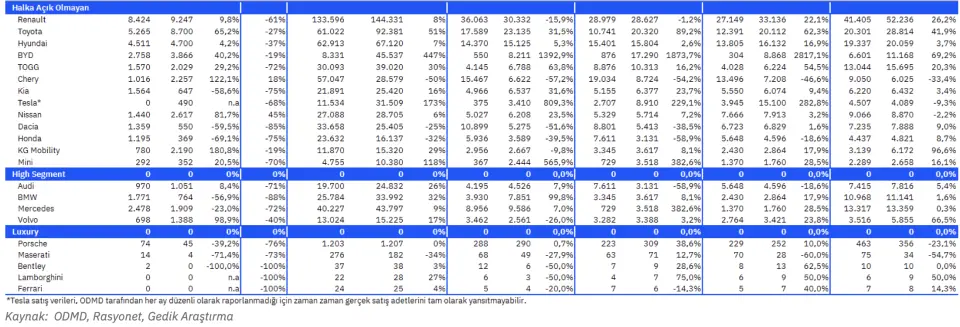- "TOGG perakende satış hacmi yıllık bazda %29 artışla 2,0 bin adet oldu. BYD, 2026’ya Türkiye pazarında güçlü bir ivmeyle başladı ve Oca26’da 3,9 bin adetlik satış gerçekleştirdi (yıllık +%40). Bu performans, markayı genel sıralamada 7. sıraya, binek segmentinde ise 5. sıraya taşıdı. Karşılaştırma açısından, BYD 2025’i binek segmentinde 9. sırada, toplam pazarda ise 10. sırada tamamlamıştı. Dolayısıyla Oca26’daki güçlü performans, 2025’in son döneminde görülen yavaşlamanın 2026’ya taşınmadığına işaret ediyor gibi görünüyor. Ancak, gümrük konusunun yumuşamasının da bu durum üzerinde önemli etkisinin olabileceğini düşünüyoruz."