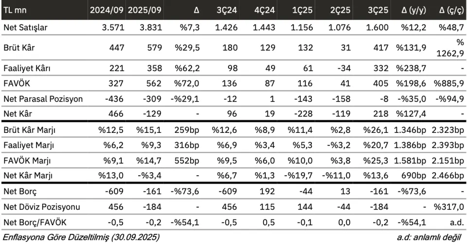 - "Şirket, 3Ç25'te 6 milyon TL net finansal zarar (yatırım gelirleri dahil) kaydederken, 3Ç24'te 13,6 milyon TL kar kaydetmişti. Böylelikle, şirket 3Ç25'te 218 milyon TL net kar elde etmiştir. 3Ç24'te 609 milyon TL olan net nakit pozisyonu, 3Ç25'te 161 milyon TL olmuştur. Hisse son 12 aylık verilere göre 7,2x FD/FAVÖK ile işlem görmektedir. Finansal sonuçların hisse üzerindeki etkisini sınırlı pozitif olarak değerlendiriyoruz."