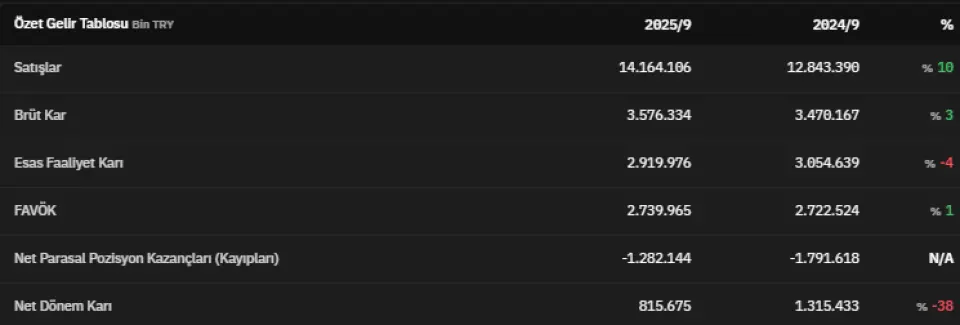 FAVÖK 2025 yılının üçüncü çeyreğinde 2.739.965.000 TL olarak açıklandı. Net parasal pozisyon kazançları 2025 yılının üçüncü çeyreğinde -1.282.144.000 TL olarak kaydedildi. Net dönem kârı ise 815.675.000 TL olarak kaydedildi.