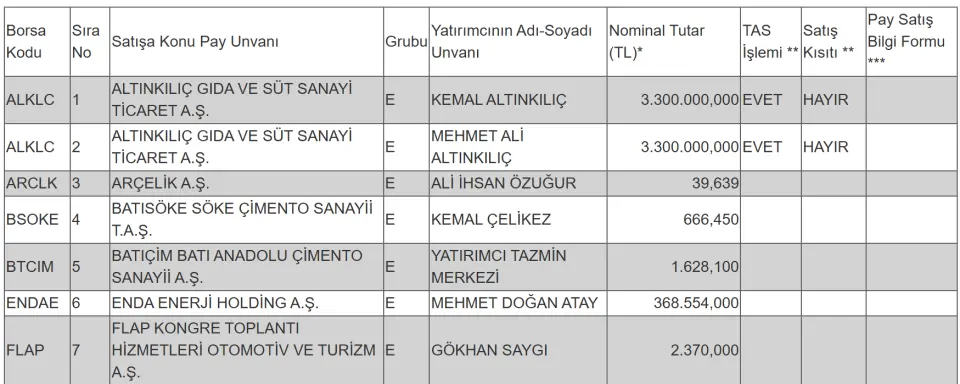 Bu işleme konu olan bir şirket oldu. Bu şirket, ALTINKILIÇ GIDA VE SÜT SANAYİ TİCARET A.Ş.olurken, çeşitli yatırımcılar E tipi işlem görmeyen paylarının bir miktarını borsada işlem gören tipe dönüştürmek için başvuru yaptı.